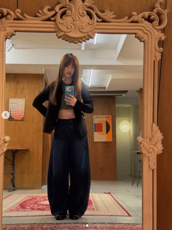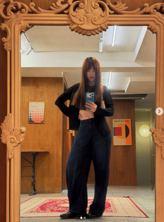 在整體造型上,Sandy穿著深灰色短版背心,中空剪裁襯托出平坦且纖細的腰身,外搭一件黑色長袖外套,營造出帥氣且具層次感的風格。下半身則選擇寬鬆的深色長褲與黑色皮鞋,呈現出俐落的時尚氣場。