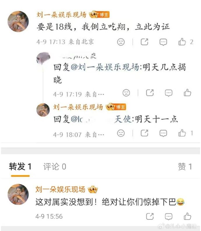 網友紛紛根據「90、95」的關鍵詞開始猜測,有人提及《入青雲》走紅的侯明昊與盧昱曉,不過被被狗仔否認,預告爆料的留言串,網友接連點名孫千、王天辰、任敏、白敬亭、古力娜扎等人。而劉大錘在與網友互動時,暗示部分網友的猜測已「接近真相」,但隨即又強調結果會是大家「絕對想不到」的組合。部分資深追星族推測,爆料對象可能涉及近期爆火的劇中CP或是私下交集極少的「冷門組合」。而狗仔劉大錘預計於10日上午11點揭曉答案。